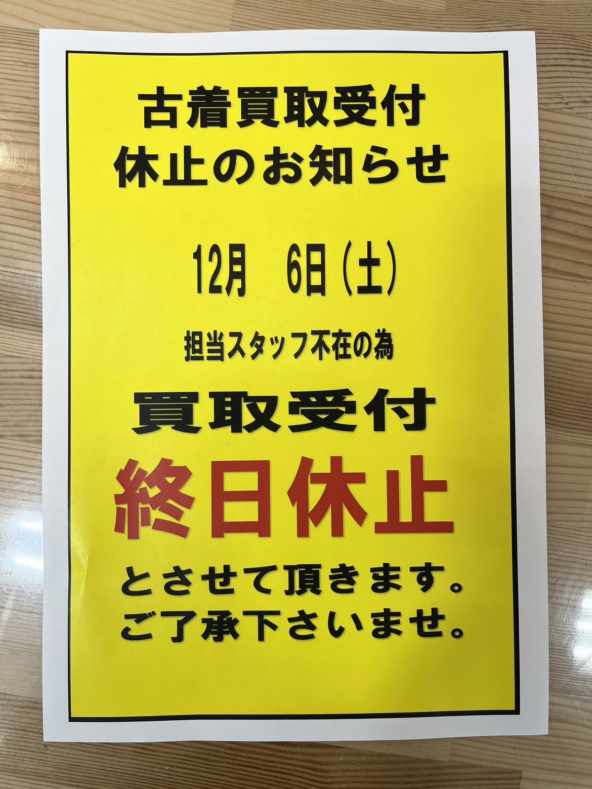 【重要】《12月6日》本日、古着スタッフ不在のため買取を終日休止とさせて頂きます【重要】 2025年12月6日 ★お知らせ★ 本日、古着スタッフ不在のため買取を終日休止とさせて頂きます。 ご迷惑をおかけ致しますがご理解の程お願い致します。