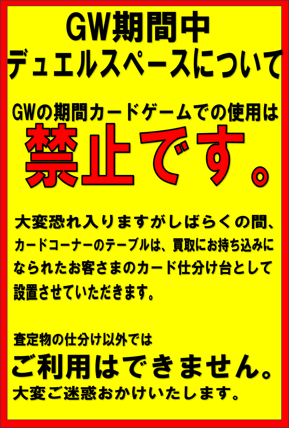 ★カード部門よりGW中のデュエルスペース使用中止のお知らせです★