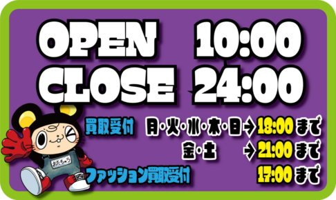 お知らせいつも当店をご利用いただきありがとうございます。 買取受付時間変更のお知らせです。 10/13日月曜日の買取受付時間を終日休止とさせて頂きます。 ご迷惑をお掛け致しますが、ご理解とご協力お願い致します。